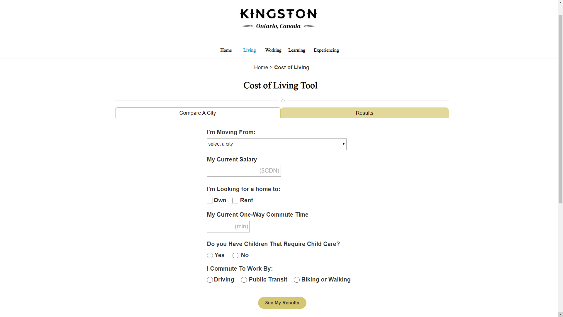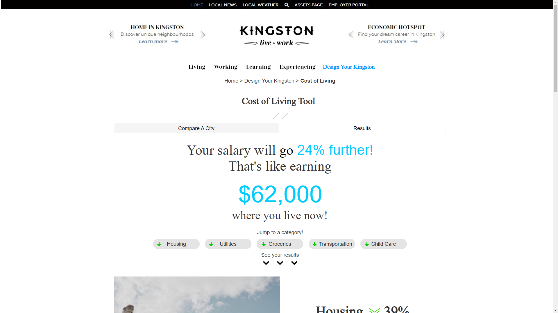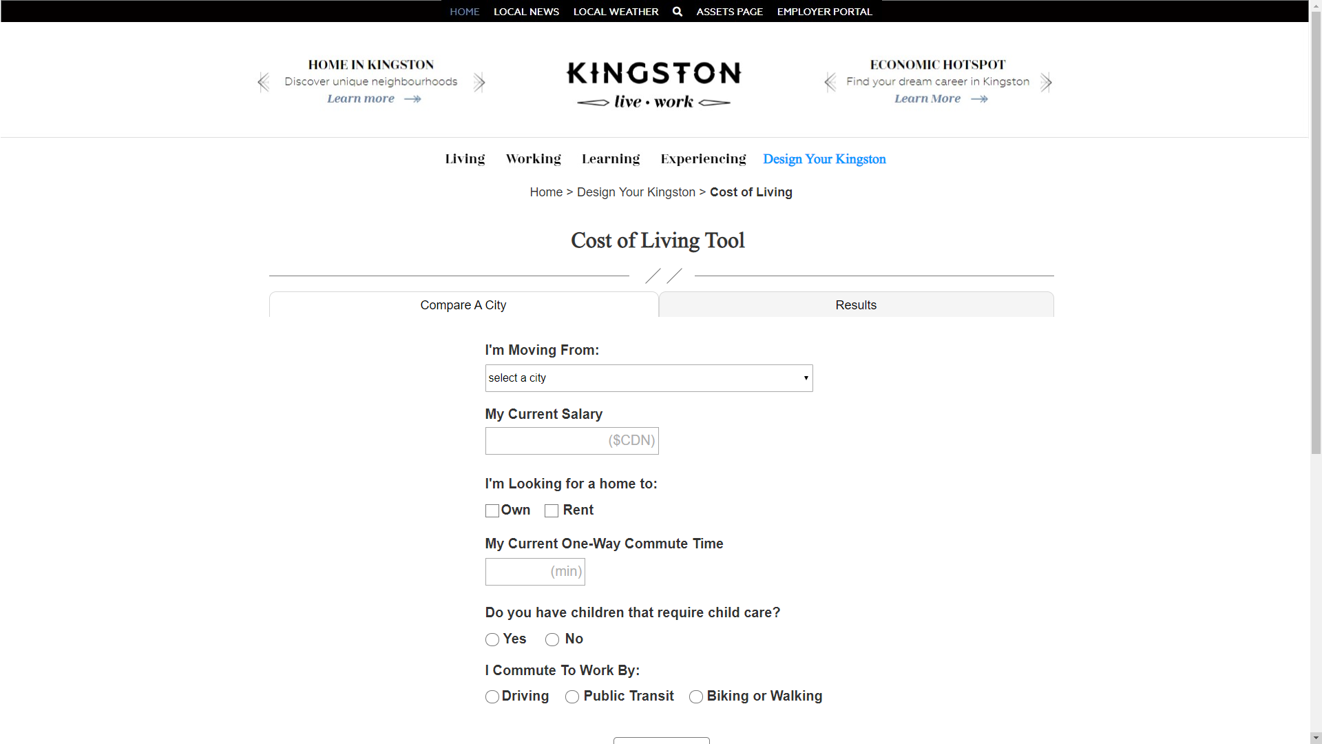 This is a desktop website that has a video on the landing page with the six tools behind a hamburger menu. The cost of living tool brings you to a page to input information and submit it to get to the results page. The results page shows how much you would make in Kingston then breaks it down once you scroll. At the bottom of the page, there is a button to go back and compare a different city.