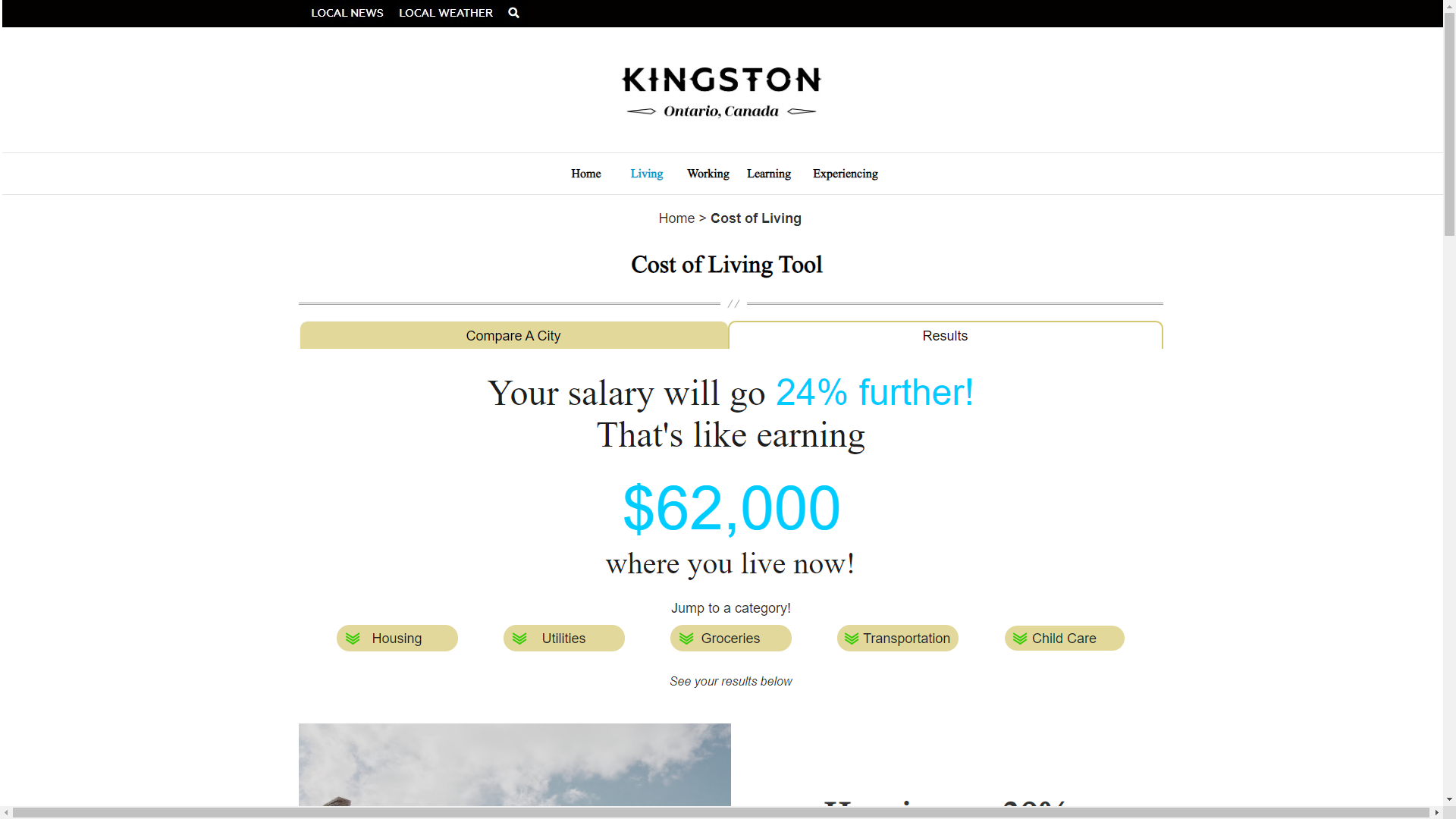 Cost of Living Results page